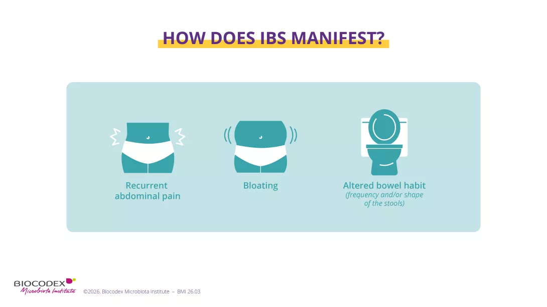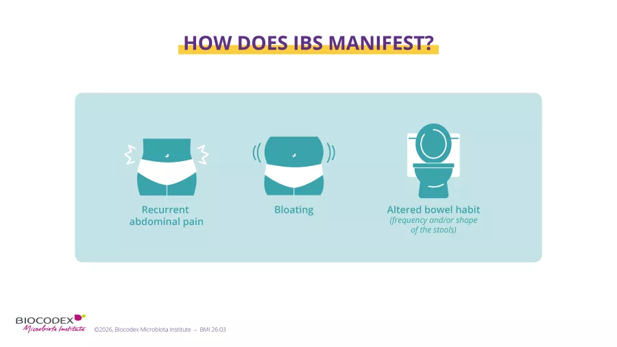 What distinguishes abdominal pain caused by IBS from other types of stomach pain? First, its recurrence: more than 4 days a month, for more than two months. But that’s not all: the symptoms are linked to bowel movements and/or a change in stool frequency and/or appearance (Rome IV criteria 3).
