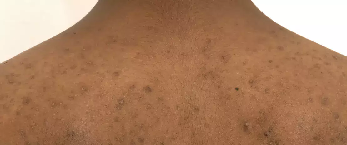 1 month later, the patient returned to see his doctor because his acne had extended to his neck (profuse impetigo). The doctor took a sample from one of the pustules for a culture test.