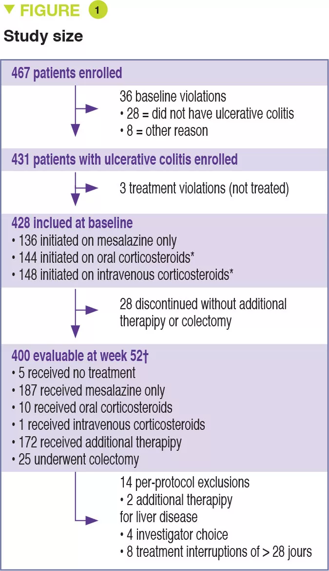Between 2012 and 2015, 467 children aged 4 to 17 years were recruited into this prospective multicenter study conducted in 29 sites in the United States and Canada (Figure 1). The primary outcome was week 52 remission, defined by a PUCAI score < 10, with no therapy other than mesalazine (no corticosteroids and no colectomy). Baseline severity was defined as mild (therapy with mesalazine or oral corticosteroids with PUCAI < 45), or moderate to severe (oral corticosteroids with PUCAI ≥ 45 or intravenous corticosteroids). In addition to the usual clinical and biological parameters, this study also assessed gene expression from rectal biopsies as well as the rectal and fecal microbiota before treatment. 428 children started therapy: mean age was 12.7 years, 50% female, 42% with mild disease (mean PUCAI 31.9 ± 12.1 SD) and 58% with moderate to severe disease (mean PUCAI 62.9 ± 13.2 SD). At week 52, 150 (38%) of 400 evaluable participants achieved corticosteroid-free remission, of whom 80 (49%) had mild disease and 70 (30%) had moderate to severe disease (Table 1).