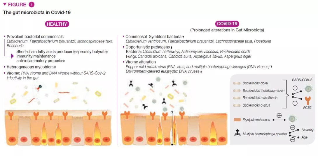 Covid-19 patients had significant alterations in the gut bacterial microbiome compared with healthy individuals, characterized by depletion of beneficial commensals and enrichment of opportunistic pathogens in the gut (Figure 1) [3]. Depletion of gut symbionts persisted even after the resolution of Covid-19. The baseline (at hospitalization) abundance of the bacteria Coprobacillus, Clostridium ramosum and Clostridium hathewayi showed positive correlation with Covid-19 severity, whereas there was an inverse correlation between the abundance of Faecalibacterium prausnitzii (known as an anti-inflammatory bacteria) and the disease severity.
