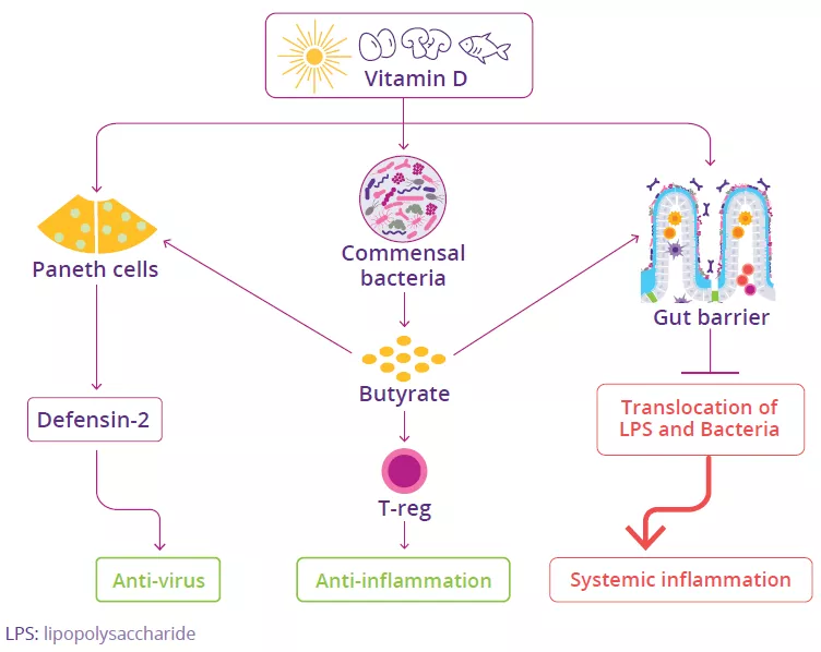 While the best characterized function of vitamin D is its role in controlling calcium levels and thereby maintain bone health, it is also known to have a significant effect on GI immune responses. Vitamin D regulates several genes that regulate gut barrier function as well as genes that encode antimicrobial peptides, thus helping to maintain intestinal balance (Fig 5).33 It exerts an immunomodulatory effect, including immune cell differentiation, migration and anti-inflammatory functions,34 and can act directly on Paneth cells to promote defensin-2 secretion.35 Vitamin D also promotes the compositional diversity of the gut microbiota, leading to increased production of butyrate. Butyrate can exert anti-inflammatory effects, increase gut barrier function, and promote Paneth cells to secrete defensins (Fig 5). Interestingly, some probiotic bacteria (e.g. Lactobacillus strains) have been shown to increase vitamin D levels in the blood.36