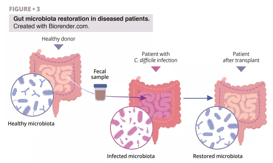 The fascinating journey of FMT discovery has roots in ancient China, where Ge Hong treated patients with severe diarrhea using a “yellow soup” consisting of feces suspension. In modern times, Dr. Ben Eiseman used fecal enemas from healthy individuals to treat pseudomembranous enterocolitis back in 1958. Nowadays, there is growing interest in fecal microbiota transplantation (FMT) as a treatment for recurrent Clostridioides difficile infection (CDI), which points out its utility [22]. Research is ongoing regarding its efficacy towards inflammatory bowel disease, diabetes, cancer, liver cirrhosis, and brain diseases such as Parkinson’s [23]. The benefits of using FMT in patients with diarrhea are based on the idea that the healthy microbial flora introduced via FMT has the ability to outcompete pathogens and restore the composition of a healthy gut microbiome (figure 3).