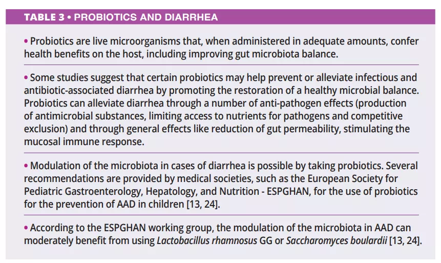 There is limited data regarding the prebiotics and fibers in treating diarrhea (table 2). Apparently, prebiotics are more prone to prevent and treat the recurrence of diarrhea. At the same time, fibers, mainly the viscous ones, are more indicated during acute episodes due to their water-retaining capacity. Other therapeutic options involve, in some cases, the probiotic administration and (table 3), in severe cases, the use of fecal microbiota transplantation (FMT).