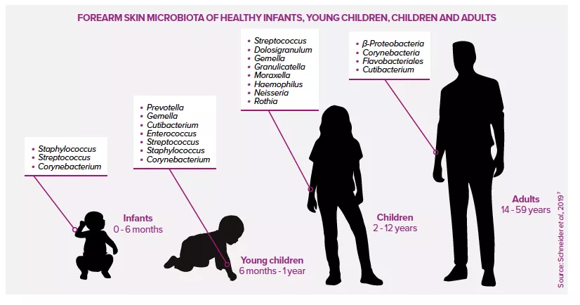 At puberty, the skin microbiota undergoes a profound restructuring due to hormonal changes that stimulate sebaceous secretions. It contains more lipophilic organisms (Cutibacterium, Malassezia), whereas previously it had been dominated by Firmicutes, Bacteroidetes and Proteobacteria, with a diverse fungal community.4