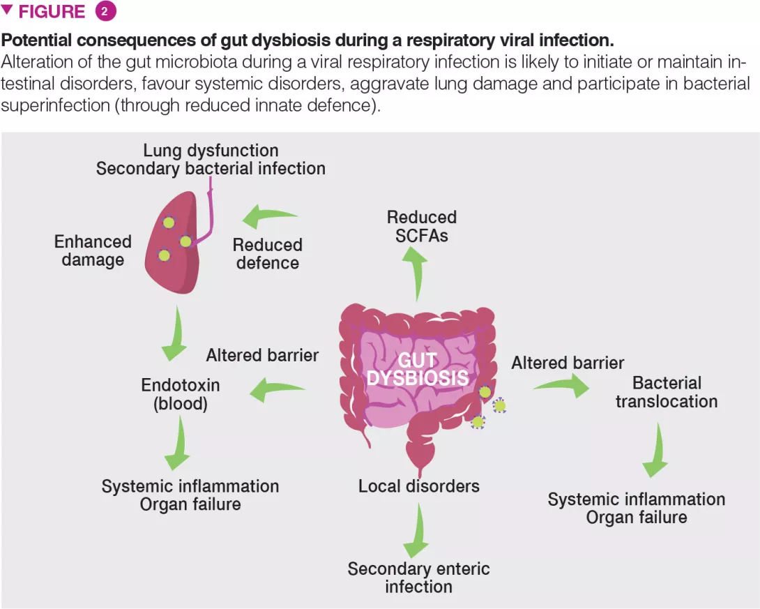 The gut-lung axis is important during viral respiratory tract infections. Alterations of the gut microbiota plays a part in secondary outcomes. The gut microbiota therefore represents a target to limit disease severity. Solutions for disease management include dietary ingredients (like prebiotic fibres) and probiotics.