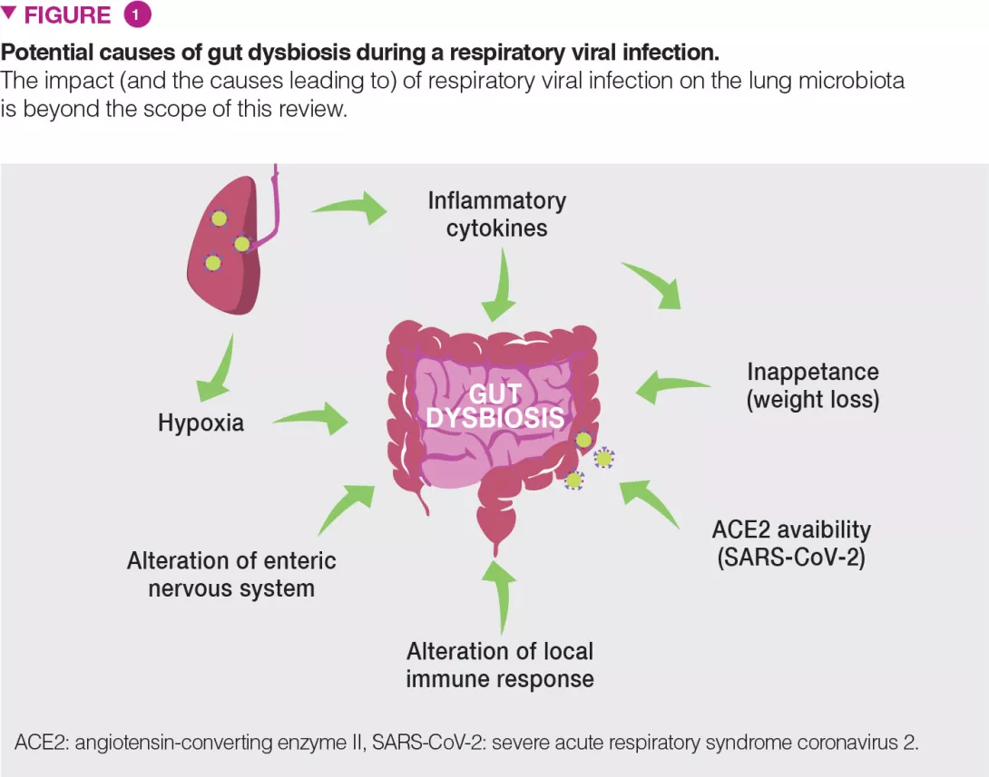 Hypoxia (a feature of acute viral respiratory infection), alterations of the enteric nervous system and dysregulated local immune response are also likely to participate in gut dysbiosis [13] (Figure 1). In the case of COVID-19, along with these mechanisms, local viral replication is likely to play a role in gut dysbiosis. Angiotensin- converting enzyme II (ACE2), the receptor of SARS-CoV-2, is instrumental to maintain the gut’s microbial ecology. Considering the lack of available ACE2 during SARS-CoV-2 infection, one expects that this might influence the composition and functions of the gut microbiota [13].