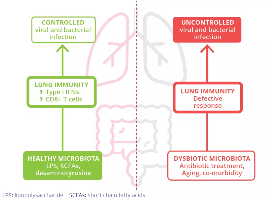 Any factors inducing gut microbiota dysbiosis (aging, antibiotics, diseases such as obesity, diabetes…) can also alter the normally beneficial gut-lung cross-talk, increasing susceptibility to respiratory infections.10