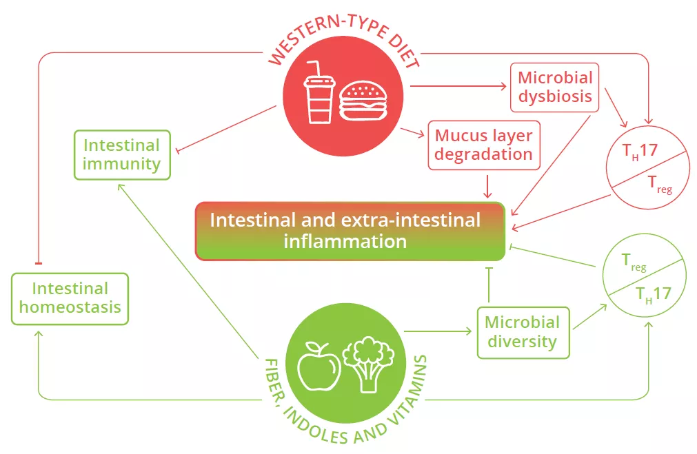 Microbial dysbiosis, mucus layer degradation and alteration of the balance of pro- and anti-inflammatory T cells in the intestine are observed in individuals consuming Western-type diets, leading to intestinal and extra-intestinal inflammation.26