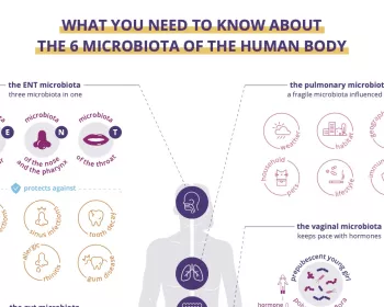 This infographic introduces the six microbiota of the human body, highlighting the unique functions and characteristics of each one, from the gut to the skin.