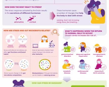 This infographic explores the connection between gut microbiota and stress, highlighting how the gut-brain axis influences both mental and physical well-being.