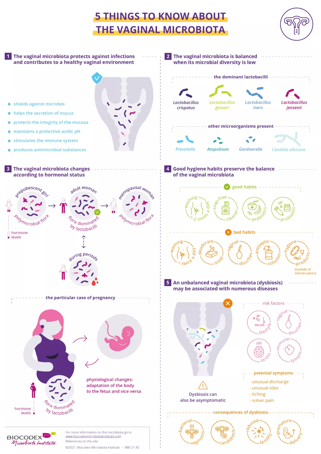 This infographic outlines 5 important things to know about the vaginal microbiota, including how it protects against infections and how hormonal changes affect its composition.
