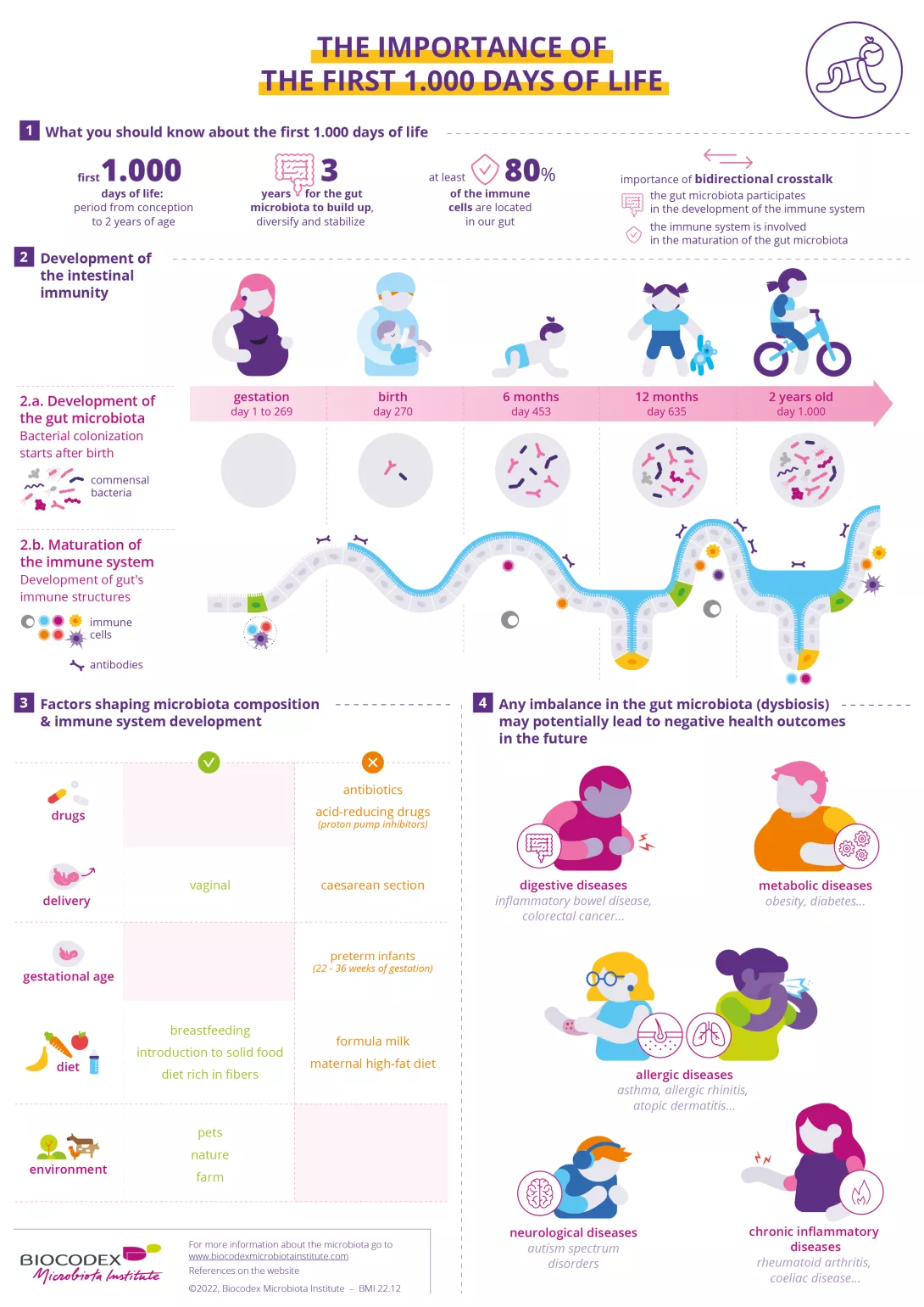This infographic highlights the critical importance of the first 1,000 days of an infant’s life, from conception to toddlerhood, in the development of gut microbiota and intestinal immunity. It explains how early factors, such as diet and environment, influence long-term health.