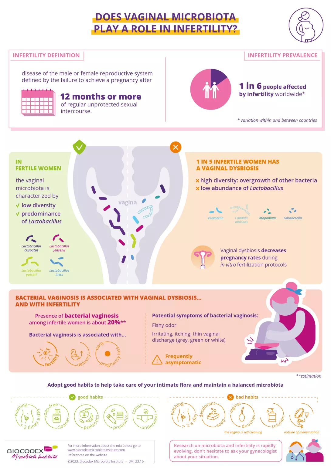 This infographic highlights the link between microbiota and fertility, emphasizing the importance of maintaining a balanced ecosystem through proper hygiene and patient education.