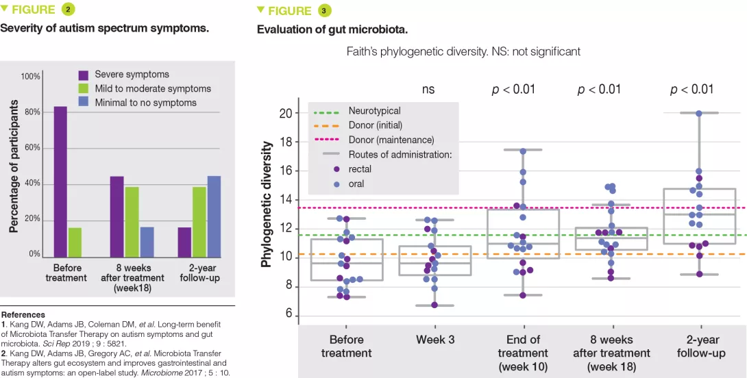 These findings indicate that microbiota transfer therapy has a durable, long-term effect on the gut microbiota. In addition, it significantly and durably improves gastrointestinal and behavioral symptoms of autism spectrum disorders. It is now essential to carry out randomized, controlled, double-blind studies in children with ASD who do or do not have gastrointestinal problems. Indeed, dysbiosis may be present and impact the gut-brain axis even in the absence of gastrointestinal symptoms. The results of this study should be confirmed before this approach is used in clinical practice.