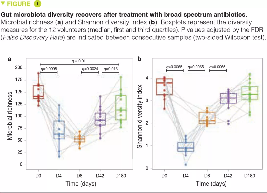 The human gut microbiota forms a complex and balanced ecosystem. Perturbations of this ecosystem can play a role in the development of infections, obesity, diabetes as well as neurological and inflammatory disorders. It is estimated that antibiotics have added 2 to 10 years to our life expectancy, but early exposure to these drugs has also been associated with noxious metabolic, inflammatory and neurological effects, both in animal models and in humans. When microbial communities are exposed to antibiotics, not only do they react by shifting their composition, but also by evolving, optimizing and disseminating antibiotic resistant genes (ABR genes) which collectively form the resistome.[2] The human gut microbiota is a reservoir of ABR genes which are exchanged between the resident strains, thereby propagating resistance.[3] The development and spread of antibiotic-resistant bacteria constitute a serious threat to public health. Only a few studies have investigated the effects of specific antibiotics on intestinal ecosystems and their associated resistomes. In previous work it was shown that antibiotic administration induces a decrease in microbiota diversity and an in- crease in the carriage of ABR genes.[4, 5] However, the effects of a combination of antibiotics on the microbiota and the role of ABR genes in microbial persistence have not yet been studied. In this study, 12 healthy men aged 18 to 40 years received a cocktail of three last-resort antibiotics (vancomycin, gentamicin and meropenem). The authors analysed the impact of this treatment on the gut microbiota by shotgun sequencing of faecal samples taken before and at four time points over a 6-month period following antibiotic administration.