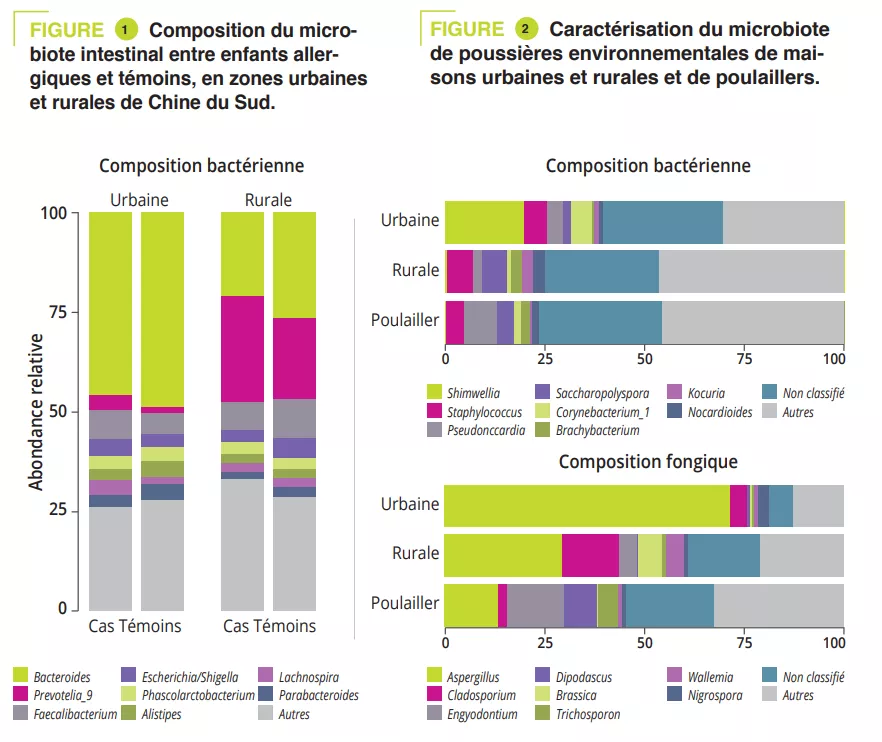 This study reported differences in the composition of dust microbiota between urban and rural areas in China. These modulate differently the gut microbiota and its immune response in allergic diseases.
