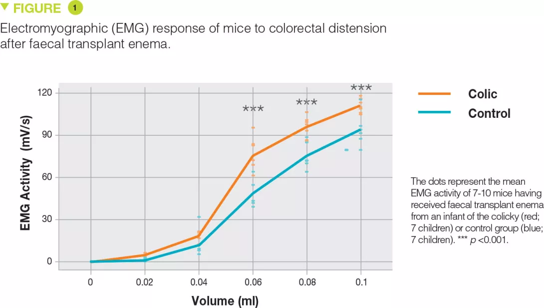 Faecal microbiota enema transplants from colicky infants to mice can induce visceral hypersensitivity. This is promoted by a painful abdominal mechanism and the direct or indirect involvement of the gut microbiota in the pathophysiology of infantile colic. This model could be used to determine which metabolic pathways are modified by a disturbance of the gut microbiota and involved in infantile colic.