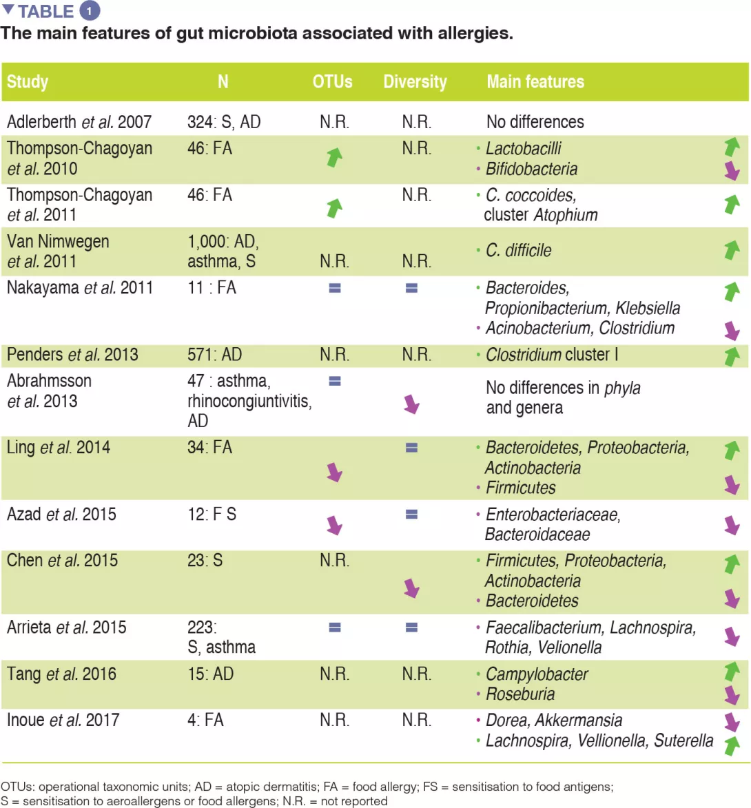 Although compelling evidence for an association between GM dysbiosis and FAs is emerging, heterogeneity in study design (involving sampling time points, the methods used to characterise microbiota, and allergic phenotypes studied) has made it difficult to establish a causal relationship between specific bacterial taxa and the development of allergies. No specific bacterial taxa have been consistently associated with FA and a broad range of microbes isolated from the human gut may be involved in tolerogenic mechanisms. The main evidence for allergy-associated GM is summarised in Table 1.