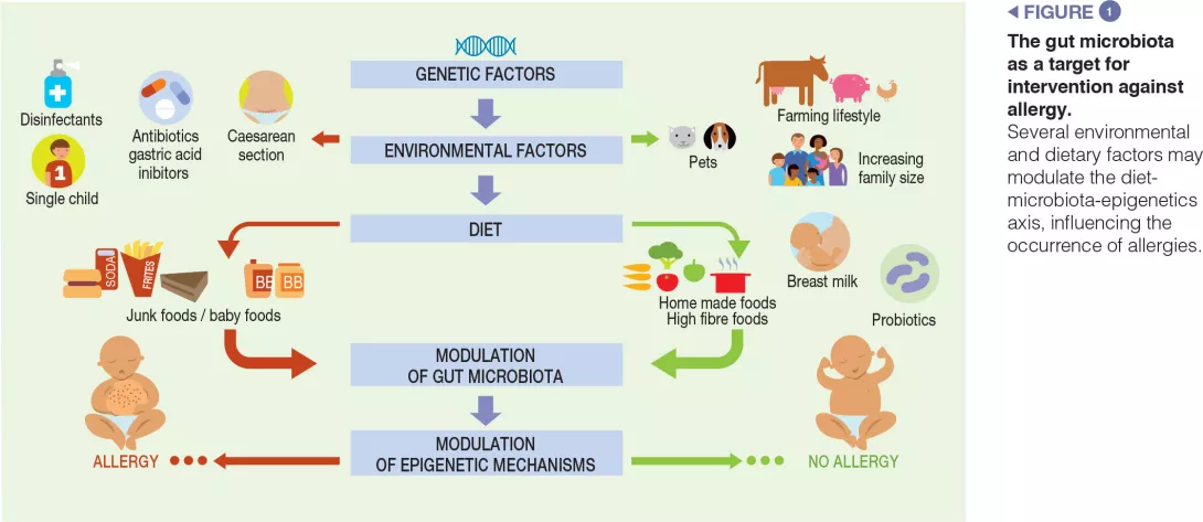Evidence suggests that the gut microbiota-epigenetics axis, modulated by a number of environmental and dietary factors, plays an important role in the occurrence of allergies. This axis regulates a number of non-immune and immune tolerogenic mechanisms, and could be the ideal target for innovative, preventive, and therapeutic strategies against allergies.