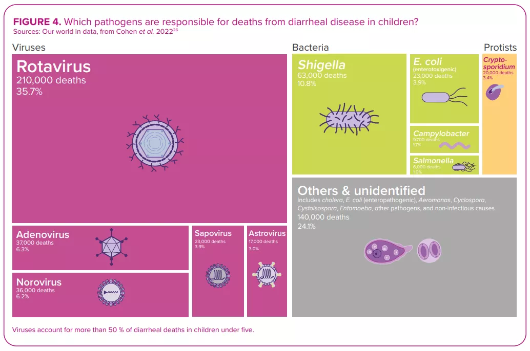 Despite the development and availability of rotavirus vaccines since 2006,22 this virus, which causes more severe symptoms than most other enteric pathogens,22 was still responsible for over 228,000 deaths worldwide in 2016, of which over 128,000 occurred in children below the age of 52 – making rotavirus the leading cause of diarrhearelated mortalities among this segment of the population (Figure 4).