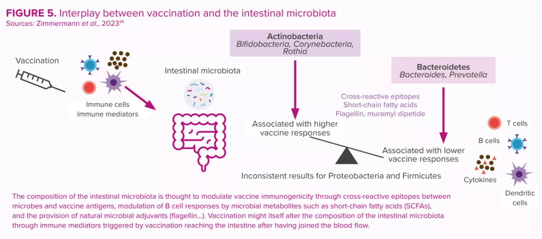 Since their introduction in 2006, oral rotavirus vaccines (ORVVs) have at a global level led to a significant drop in the number of hospitalisations and deaths due to rotavirus diarrhea.30 However, the efficacy of the vaccines has been varied, with low-income countries suffering from lower performance compared to the remarkably high efficacy (>90%) observed in higher income countries.31 Reasons for this disparity are thought to be multi-factorial (host immunity, perinatal outcomes, genetics, nutritional status, stress, tobacco and alcohol use, rural versus urban location, family size, etc.). Just as for other vaccines, the composition and function of the gut microbiota is considered to be a key factor that regulates the immune response to vaccination30,32,33 (Figure 5).