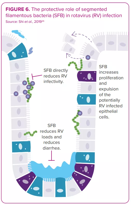 The gut microbiota displays bidirectional interactions with rotavirus and norovirus infections:14 it can either protect against or predispose the host to infection; in turn, an infection can alter the gut microbiota. Some bacteria seem able to inhibit viral infection. For example, one study shows segmented filamentous bacteria preventing and curing rotavirus infection in mouse colonies35 (Figure 6). On the other hand, in vitro and in vivo studies indicate the gut microbiota’s involvement in facilitating viral infection: certain gut microbes (e.g. Enterobacter cloacae) stimulate the ability of human norovirus to infect human B cells in vitro; microbiota elimination by antibiotics delays infection, reduces infectivity and/or viral titer of norovirus and rotavirus in mice.8,36