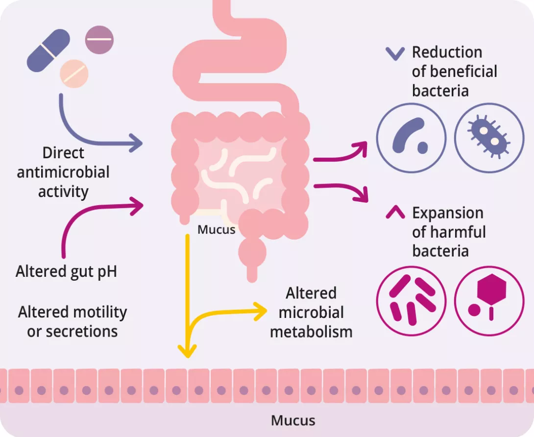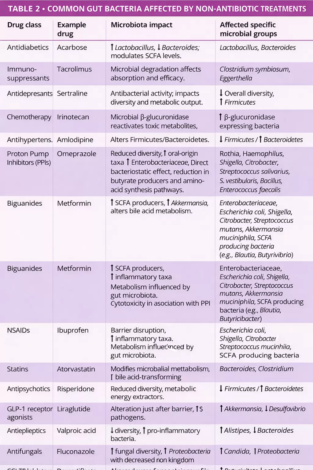 Beyond antibiotics, many non-antibiotic drugs including PPIs, metformin, NSAIDs, antipsychotics, and statins also alter the gut microbiota (figure 1, table 2) 7, 8. Drugs influence the gut microbiota through various mechanisms direct antimicrobial action, altered pH, bile acid modulation, intestinal motility changes, and mucus secretion 9.