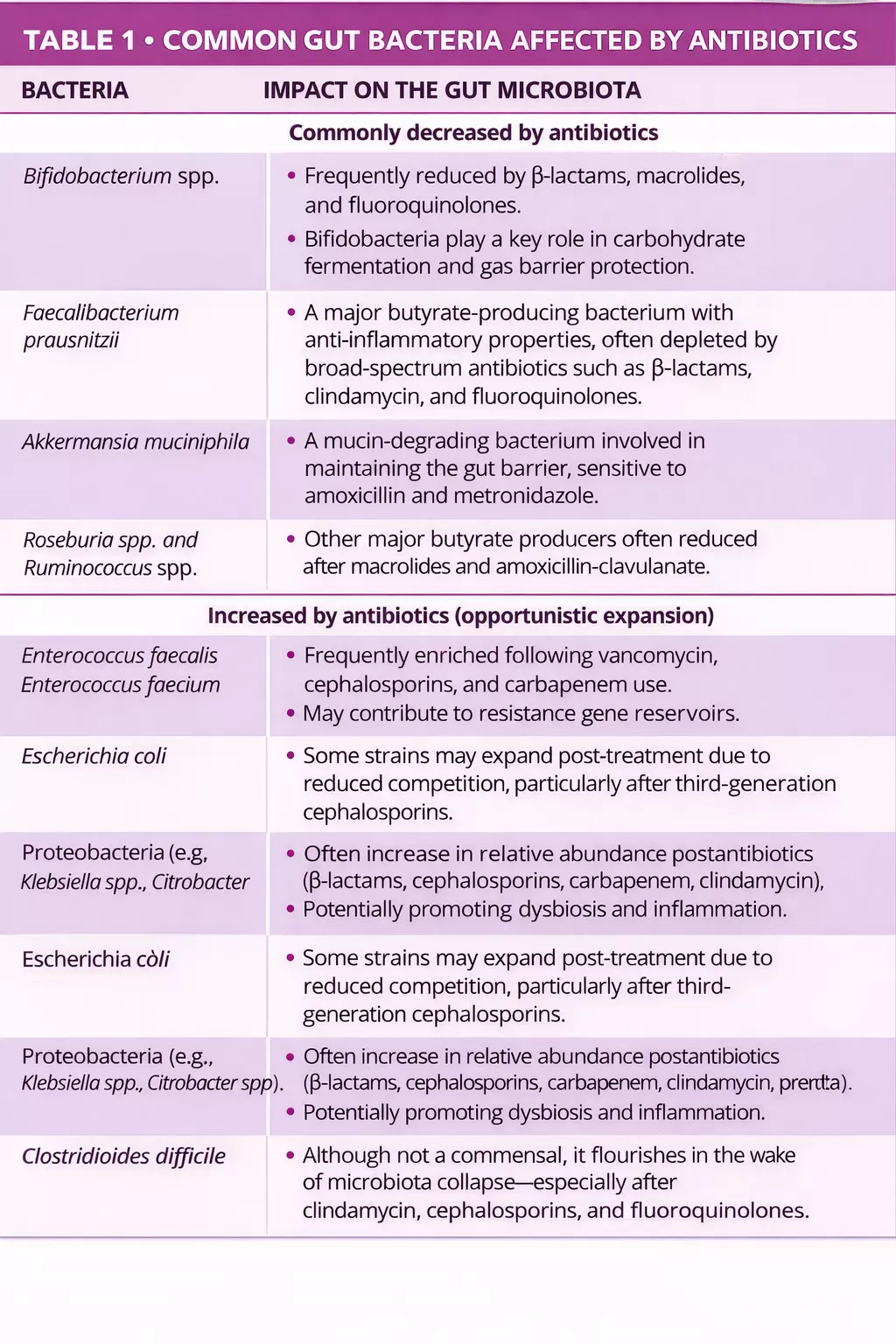 Antibiotics are well known to disrupt the gut microbiota by reducing diversity, altering composition, and promoting resistant strains (table 1) 5, 6. Van Zyl et al. found that antibiotics especially quinolones and β-lactams consistently disrupt microbial communities across body sites, with combination regimens causing prolonged dysbiosis and increased pathogenic burden 5. Similarly, Maier et al. showed that different antibiotic classes have distinct effects on gut bacteria, with macrolides and tetracyclines causing sustained losses in anaerobes, and drugs like amoxicillin and ceftriaxone shifting populations toward Proteobacteria. Despite individual variability, a common trend emerged: depletion of obligate anaerobes (e.g., Firmicutes) and enrichment of facultative and potentially pathogenic microorganisms 6.
