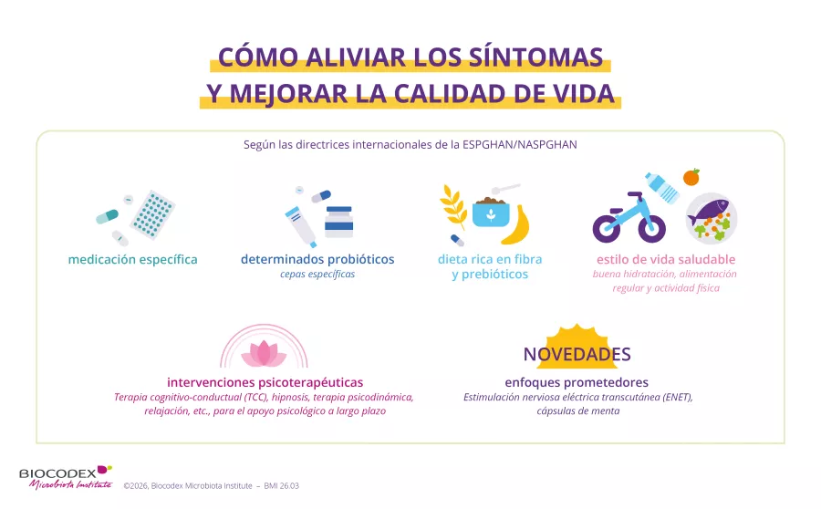 Una alimentación rica en fibra, el empleo de probióticos específicos (para apoyar a las bacterias beneficiosas) o de antibióticos (para eliminar bacterias patógenas) representan estrategias que pueden ayudar a Louise o Raphaël, siempre bajo supervisión médica. 8, 9