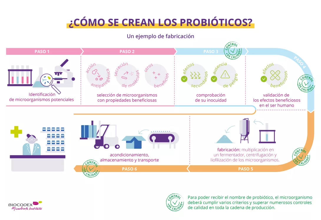 La fabricación de los probióticos exige el dominio de un procedimiento técnico delicado y controles estrictos repetidos en cada etapa de la cadena de producción. En efecto, debe garantizar al consumidor un producto final que cumpla todas las normas de calidad y seguridad. Los microorganismos probióticos deben mantenerse vivos, en número suficiente y estable hasta el final del periodo de conservación del producto, dosificarse correctamente para el beneficio previsto y carecer de contaminantes.5,6,51