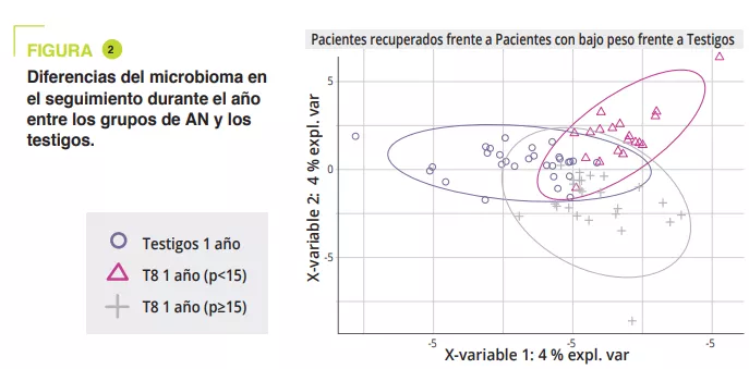 Existe una disbiosis en la fase aguda de la AN que mejora en parte gracias al abordaje. La composición del MI en el momento del ingreso puede ayudar a predecir el riesgo de recaída durante el primer año y de mejora del IMC al año. Por ello, es posible que el análisis del MI en el momento del ingreso pueda ayudar a identificar los géneros y taxones Parasutturella, Lachnospiraceae FCS020 group, Clostridium stricto sensu y Alistipes no cultivadas como factores de mal pronóstico. Como una mayor abundancia de Sutterella fue un indicador de evolución favorable, podría ser un objetivo como probiótico.