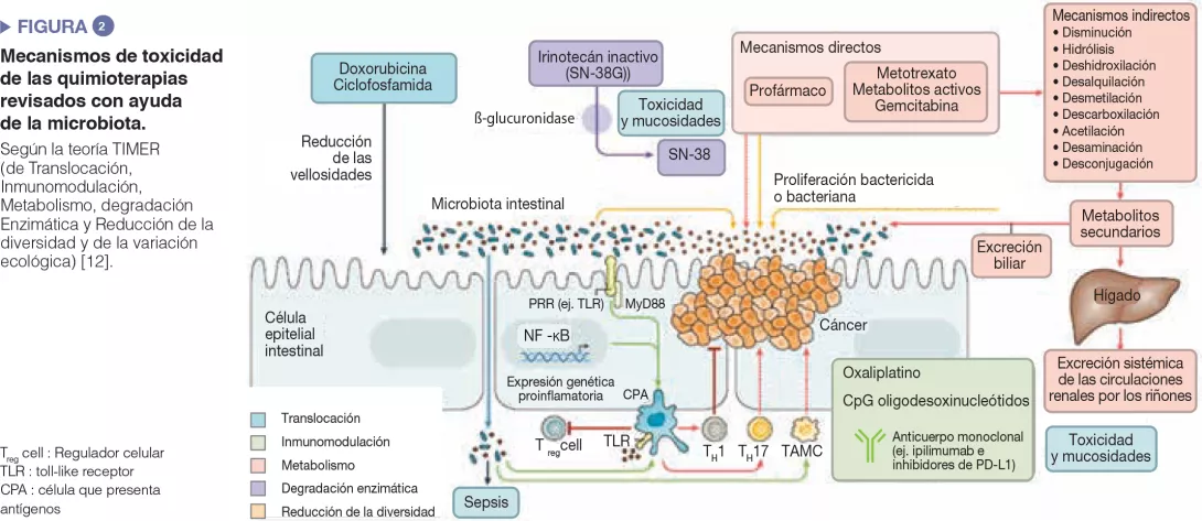 La capacidad de la microbiota intestinal para modular la respuesta a la quimioterapia anticancerígena y a la inmunoterapia se ha observado en ratones y en seres humanos. Los carcinomas de pulmón, de riñón, y el melanoma han sido objeto de estudios clínicos. Esta influencia nunca se puede atribuir a una sola especie: en todos los casos, se trata del impacto de una comunidad microbiana intestinal en su conjunto sobre la inmunidad o una función compartida por diferentes bacterias. Estas últimas influyen en los efectos secundarios o en la resistencia terapéutica (Figura 2). A modo de ejemplo, la actividad citidina- deaminasa de las proteobacterias, en particular de Mycoplasma hyorhinis, metaboliza la gemcitabina y reduce su eficacia. Del mismo modo, la ciclofosfamida presenta efectos antitumorales variables según la dosis administrada; las bacterias grampositivas (como Enterococcus hirae) y gramnegativas (como Barnesiella intestinihominis) modulan su eficacia [12].