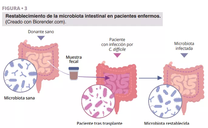 La fascinante trayectoria del descubrimiento del TMF se remonta a la antigua China, donde Ge Hong trataba a los pacientes con diarrea grave con una “sopa amarilla” que consistía en una suspensión de heces. Más recientemente, el Dr. Ben Eiseman utilizó enemas fecales de personas sanas para tratar enterocolitis pseudomembranosa en 1958. En la actualidad, existe un creciente interés por el trasplante de microbiota fecal (TMF) como tratamiento para la infección recidivante por Clostridioides difficile (CDI), lo que pone de manifiesto su utilidad [22]. Se está investigando su eficacia en enfermedades inflamatorias intestinales, diabetes, cáncer, cirrosis hepática y enfermedades cerebrales como el Parkinson [23]. Los beneficios de usar el TMF en pacientes con diarrea se basan en la idea de que la flora microbiana sana introducida mediante el TMF tiene la capacidad de superar a los patógenos y de restablecer la composición de un microbioma intestinal sano (figura 3).