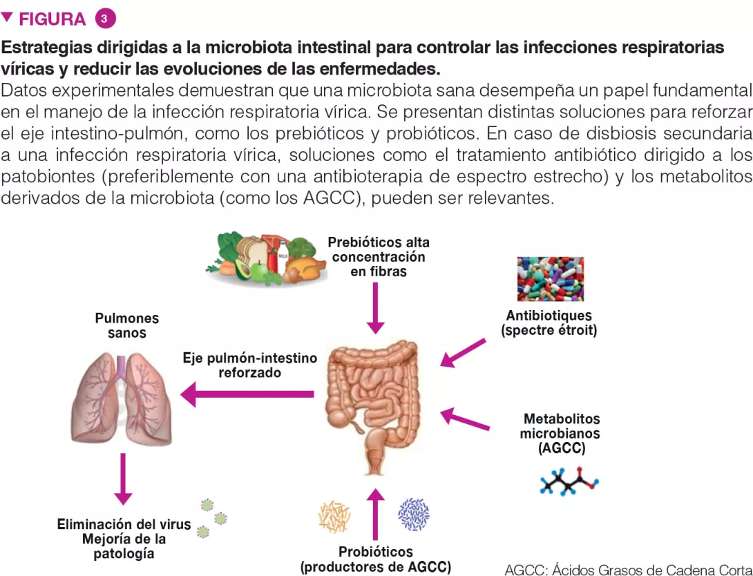 Durante una gripe, este eje se ve alterado y bacterias oportunistas invaden los pulmones, produciendo una sobreinfección bacteriana, que es una de las causas principales de muerte en las epidemias y pandemias de gripe [1]. Hemos mostrado que una menor producción de acetato (el AGCC principal) por la microbiota intestinal es parcialmente responsable de este efecto [9]. Conjuntamente, la disbiosis puede influir en las señales y síntomas gastrointestinales y pulmonares (así como en la mortalidad general) de las infecciones respiratorias víricas. ¿Podemos usar las vías intestino-pulmones como base para controlar mejor la gravedad y la tasa de mortalidad de las infecciones respiratorias víricas?