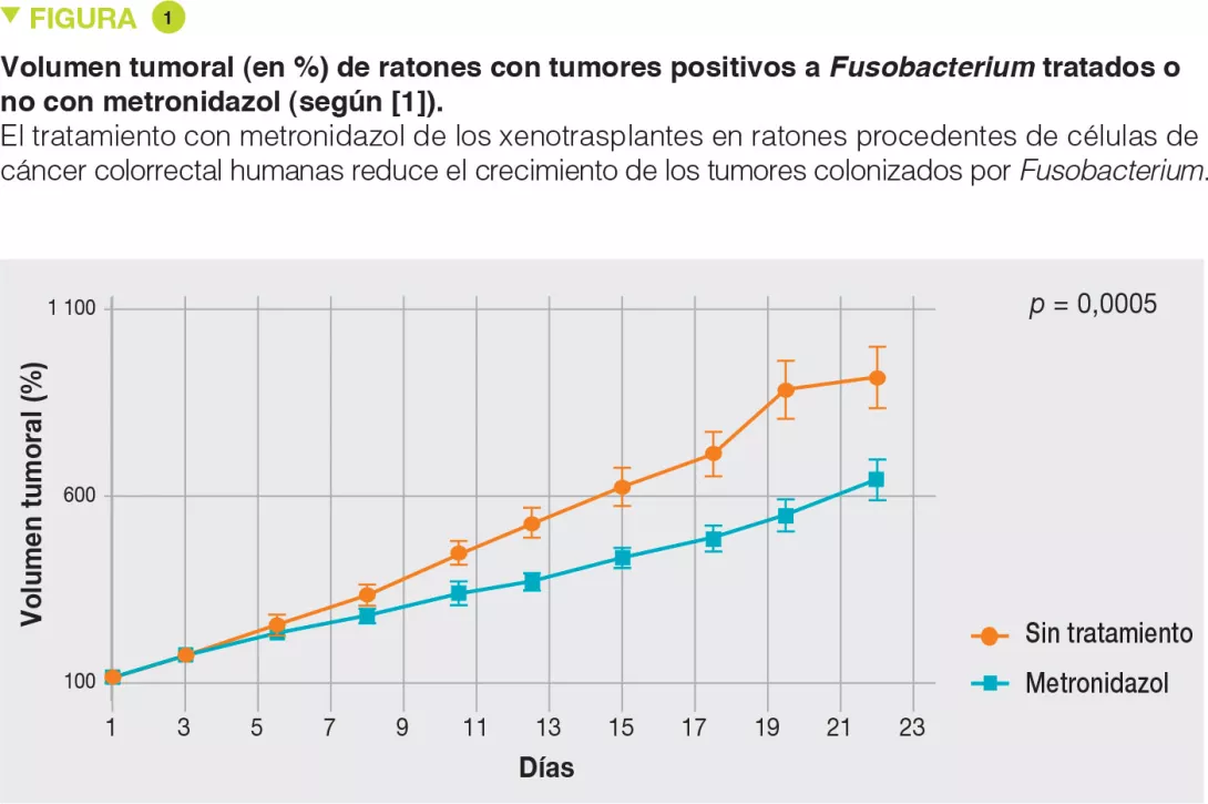 Para determinar el papel de Fusobacterium y de su microbiota asociada en el CCR, los autores analizaron la microbiota de 5 cohortes independientes de pacientes con CCR. Mediante muestras congeladas (11 casos), la evaluación de la presencia de Fusobacterium por cultivo ofreció resultados positivos en más del 70% de las ocasiones, demostrando que la bacteria permanece viva dentro del tejido tumoral. Por otra parte, cuando se dispuso de tejido metastásico de buena calidad, Fusobacterium también aparecía en los cultivos. La investigación molecular (PCR cuantitativa) mostró una sensibilidad superior, con más del 80% y del 60% de resultados positivos en el caso de los tejidos primitivos y metastásicos, respectivamente. Los Fusobacterium identificados en los tejidos metastásicos eran los mismos que aparecían en la lesión primitiva. Además de Fusobacterium, se identificaron otras bacterias con un perfil similar, como Bacteroides fragilis o Bacteroides thetaiotaomicron, pero, a diferencia de Fusobacterium, las cepas identificadas en las metástasis eran distintas de las que se encontraron en la lesión primitiva. En una cohorte de 77 pacientes, los autores observaron que no existía relación alguna entre la presencia de Fusobacterium observada mediante cultivo y la recidiva tumoral. Para determinar si la presencia de Fusobacterium desempeña algún papel en la carcinogénesis, o si, por lo contrario, ejerce una función meramente testimonial en el proceso canceroso, los autores utilizaron diversos sistemas, como los xenotrasplantes de células tumorales humanas en ratones inmunodeficientes. Según sus observaciones, los tumores positivos a Fusobacterium se implantaban sin problemas en los ratones, algo que no ocurría en los tumores negativos a Fusobacterium. Por último, la aplicación de metronidazol, un antibiótico con gran actividad frente a Fusobacterium, reducía de forma significativa el crecimiento tumoral (Figura 1).