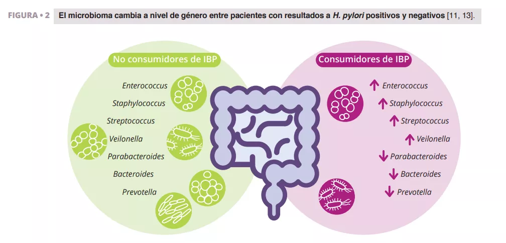Imhann et al. analizaron el microbioma de 211 personas que consumían IBP mediante la secuenciación de la región V4 del gen 16S del ARN ribosomal. Observaron una importante disminución en la diversidad alfa entre consumidores de IBP y un aumento en la abundancia de bacterias de los géneros Enterococcus, Streptococcus, Staphylococcus, y Veillonella (figura 2). Los géneros Enterococcus y Veillonella se han relacionado con una mayor susceptibilidad a las infecciones de Clostridium difficile 11. Aunque los IBP se consideran generalmente seguros y con relativamente escasos efectos secundarios, la evidencia sugiere que repercuten negativamente en el microbioma intestinal.