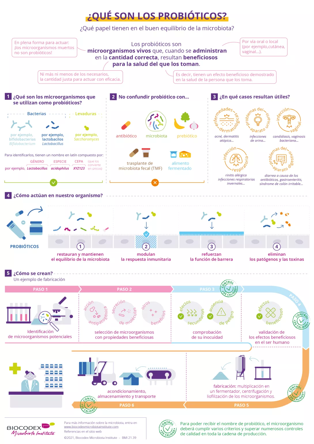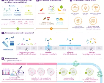 Esta infografía explica qué son los probióticos y cómo ayudan a mantener el equilibrio de la microbiota, favoreciendo la salud en general.