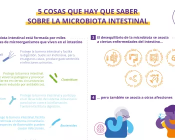Esta infografía destaca 5 datos clave sobre la microbiota intestinal y su papel fundamental en la digestión, la inmunidad y la salud en general. Explica cómo una microbiota equilibrada favorece el buen funcionamiento intestinal y protege contra patógenos, mientras que un desequilibrio puede estar relacionado con enfermedades digestivas, metabólicas e incluso neurodegenerativas.