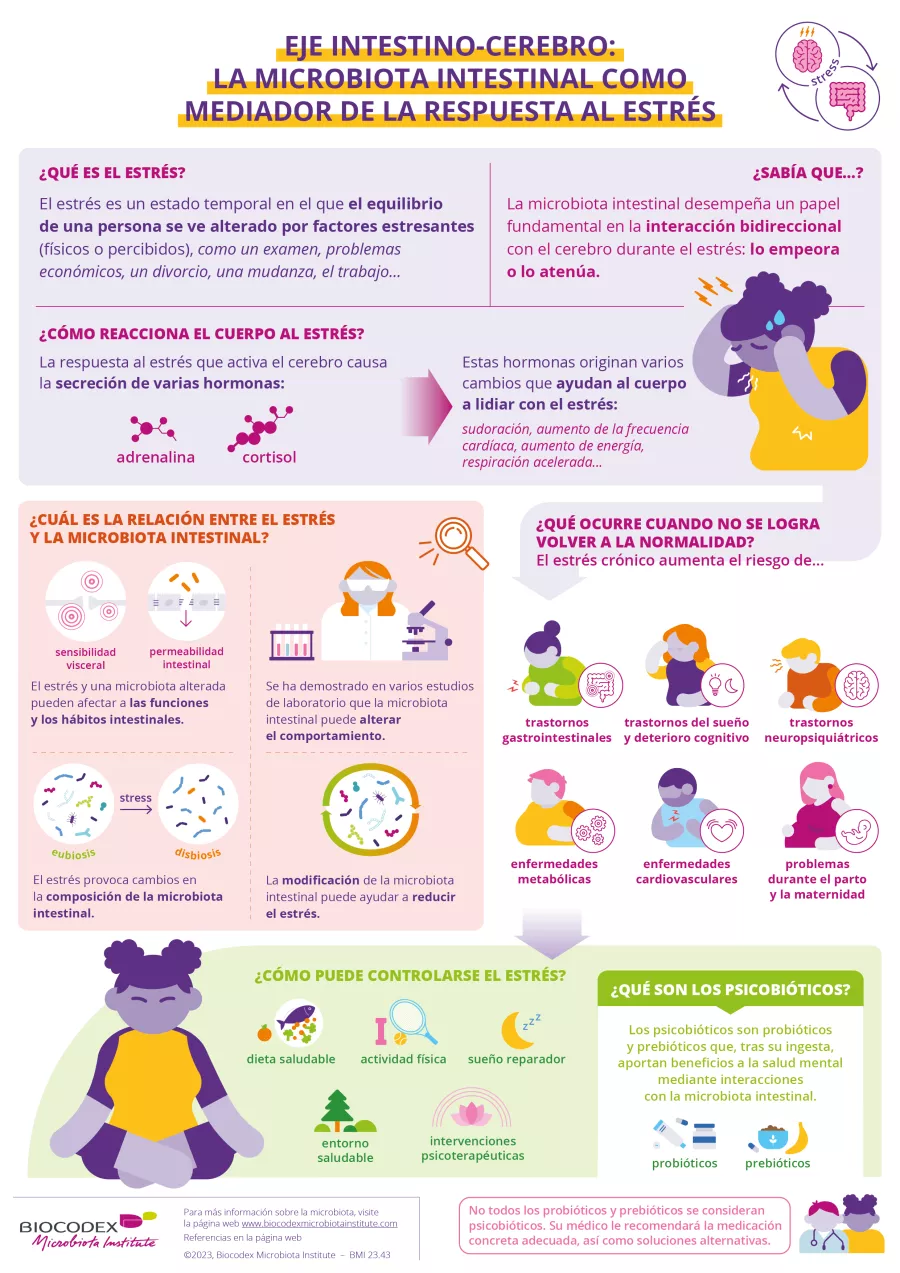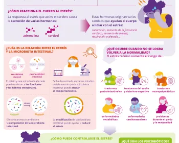 Esta infografía explora la conexión entre la microbiota intestinal y el estrés, destacando cómo el eje intestino-cerebro influye en el bienestar mental y físico.