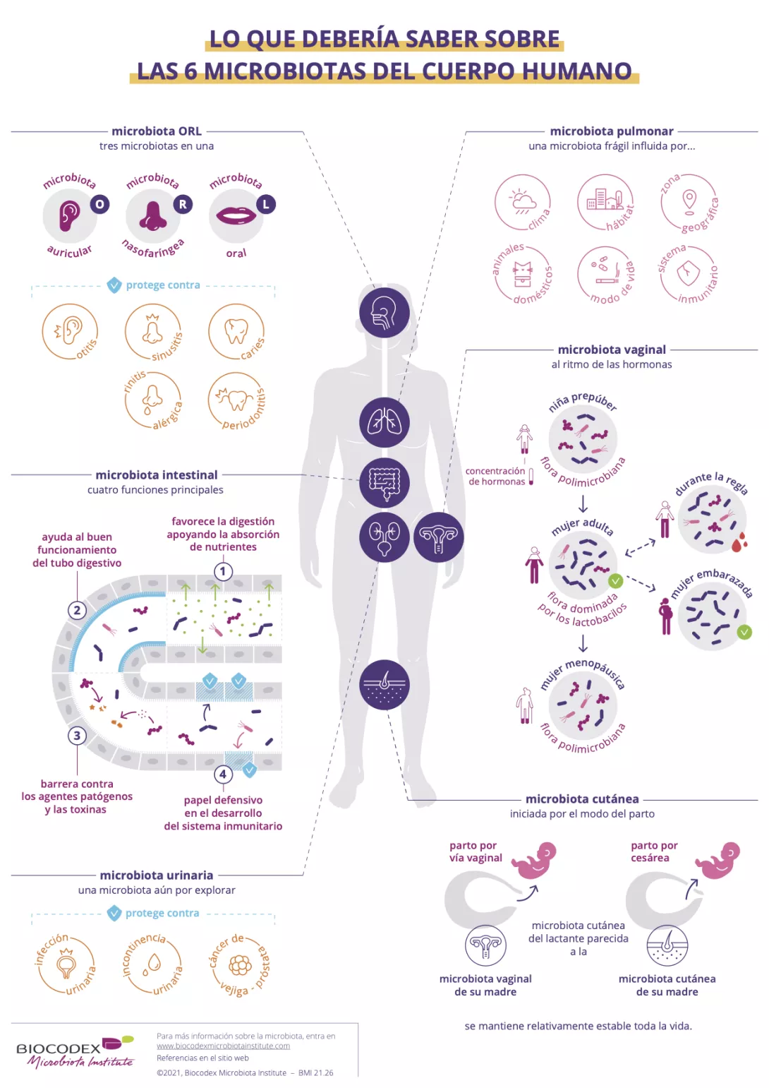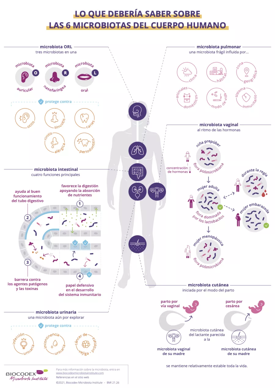 Esta infografía presenta las seis microbiotas del cuerpo humano, destacando sus funciones y características únicas, desde el intestino hasta la piel.