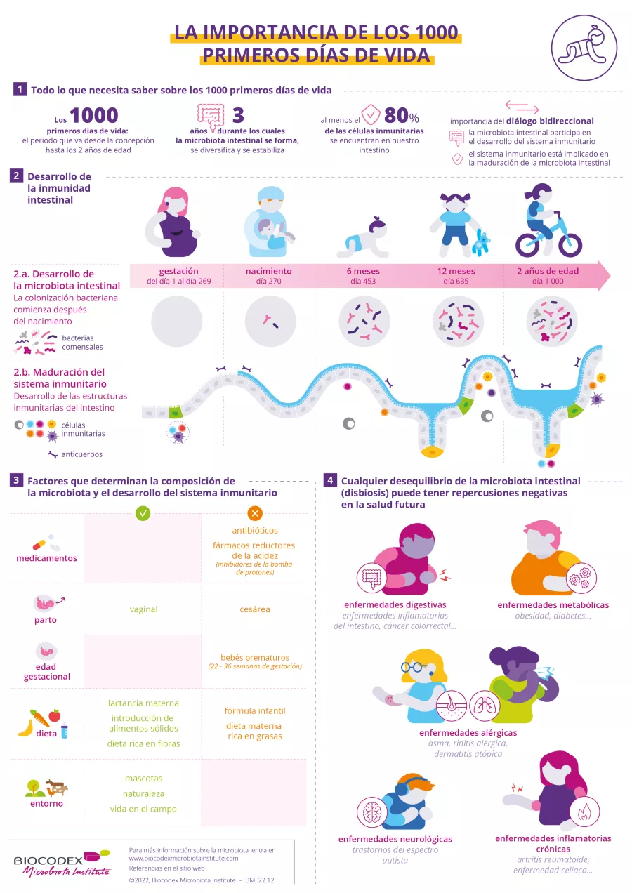 Esta infografía destaca la importancia crucial de los primeros 1.000 días de vida de un bebé, desde la concepción hasta la primera infancia, en el desarrollo de la microbiota intestinal y la inmunidad intestinal.