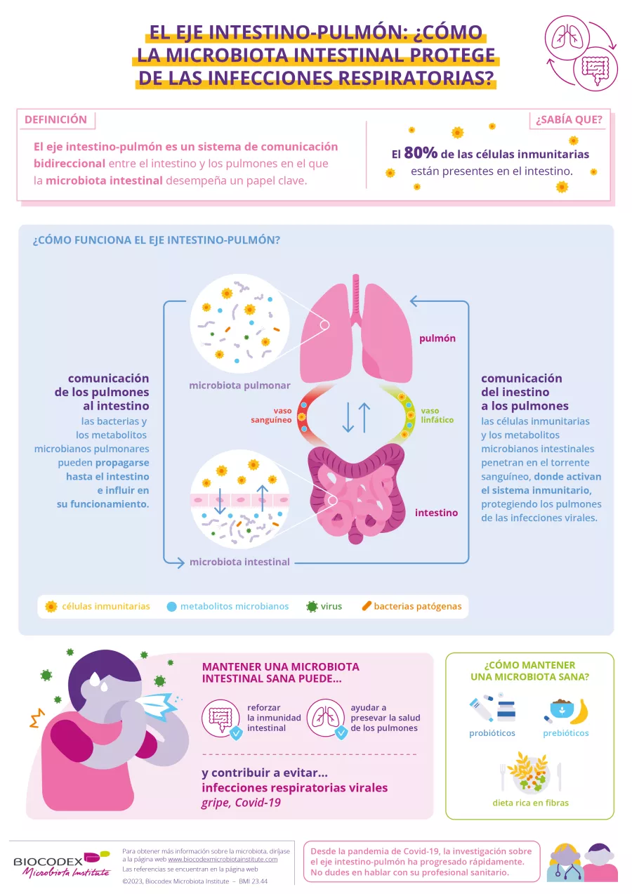 Esta infografía ilustra el eje intestino-pulmón, explicando cómo la microbiota intestinal modula las respuestas inmunitarias para proteger contra las infecciones respiratorias. Destaca la comunicación bidireccional entre el intestino y los pulmones.