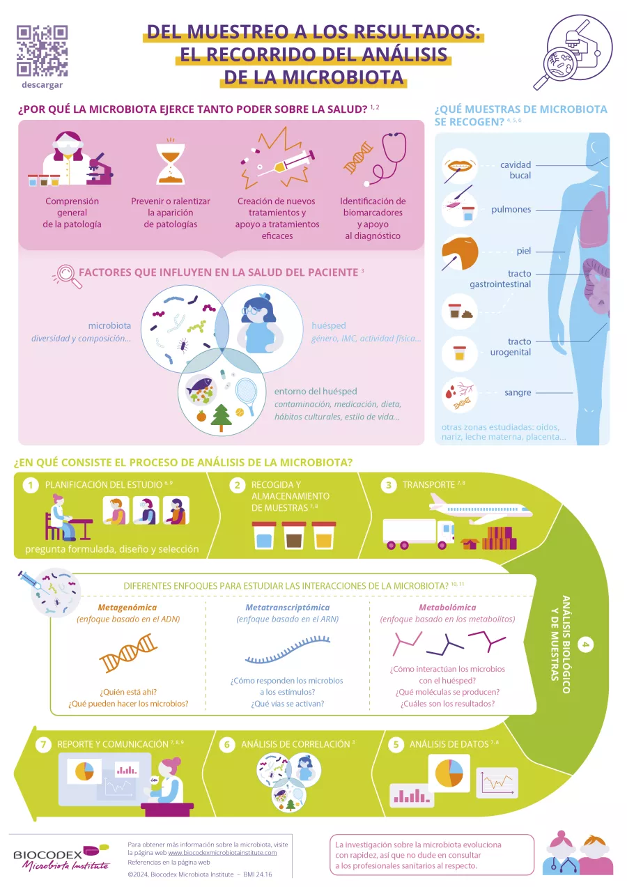 Esta infografía puede ser un primer paso para responderles. Explica las etapas clave del análisis, desde la recolección de la muestra hasta los resultados finales. Simplifique procesos complejos y descubra cómo los datos de la microbiota pueden influir en la salud y en la atención personalizada.