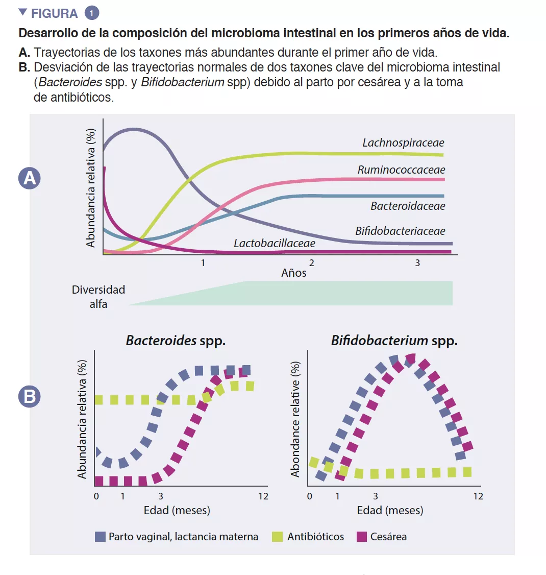El microbioma intestinal de los lactantes empieza a desarrollarse al nacimiento como un ecosistema muy simple, cuya diversidad de especies aumenta durante unos 2 o 3 años (recuadro). Este proceso se produce de manera escalonada, con patrones comunes que se han identificado en varias poblaciones humanas (Figura 1). La colonización temprana comienza con especies precursoras que provienen principalmente del canal vaginal y de las heces maternas o de la piel, en función de si el bebé nace por vía vaginal o por cesárea, respectivamente. Los bebés nacidos por vía vaginal presentan una mayor abundancia de Lactobacillus, Prevotella y Sneathia, mientras que los nacidos por cesárea están colonizados en un principio por Staphylococcus, Propionibacterium y Corynebacterium. Los lactantes amamantados presentan una mayor abundancia de Bifidobacterium sp. y de Lactobacillus sp. en comparación con los lactantes alimentados con leche artificial, que presentan una mayor abundancia de Bacteroides, Enterobacteriaceae y Clostridiaceae. A medida que se introducen los alimentos sólidos, el microbioma intestinal se vuelve cada vez más diverso y se modifica para pasar a un estado de predominio de Bacteroidaceae, Lachnospiraceae y Ruminococcaceae que se conserva en la edad adulta (Figura 1) [1].