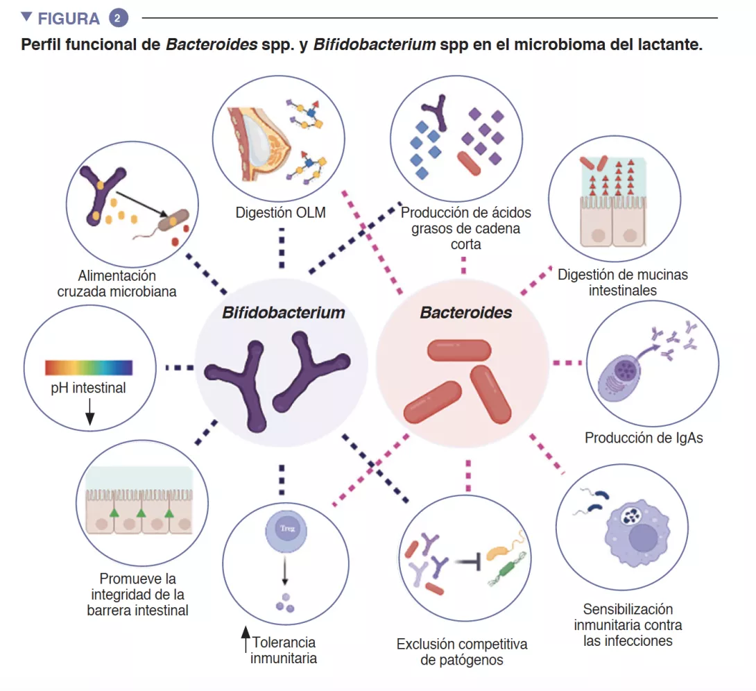 El intestino del lactante es el entorno en el que se produce un importante metabolismo que contribuye a la digestión, al metabolismo energético y a la educación inmunitaria. Gracias a la digestión microbiana de los componentes de la leche materna, las especies de Bifidobacterium reducen el pH luminal intestinal mediante la producción de lactato y acetato, lo que se considera una estrategia fundamental para aumentar la absorción intestinal de nutrientes. El acetato representa la mayor parte de los ácidos grasos de cadena corta (AGCC) que se producen en el intestino del lactante, y está implicado en la prevención de infecciones por enteropatógenos [2]. Las bifidobacterias también intervienen en un proceso conocido como alimentación cruzada, en el que la producción de acetato y de lactato sirve como sustrato para el crecimiento de otras especies, como Roseburia, Eubacterium, Faecalibacterium, y Anaeroestipes, lo que favorece la diversidad del microbioma. Las especies de Bacteroides también pueden fermentar la leche materna, y son importantes productoras de propionato, un ácido graso de cadena corta. Las especies de Bacteroides también tienen una capacidad única para metabolizar los oligosacáridos derivados de la mucina [3]. Esta plasticidad metabólica les permite adaptarse a las condiciones intestinales fluctuantes entre comidas, así como tras el destete y la introducción de alimentos sólidos. Las especies de Bacteroides también son clave para la educación inmunitaria, pues constituyen una fuente importante de lipopolisacárido, un componente microbiano, además de propiciar el desarrollo de respuestas inmunitarias adaptativas tolerógenas en el intestino [4]. Dada su especial adaptabilidad al entorno intestinal del lactante, la transmisión demostrada de cepas de madre a hijo, su predominio en el intestino del lactante, su importancia para otros miembros de este ecosistema microbiano y los beneficios para el anfitrión, es probable que tanto Bacteroides spp. como Bifidobacterium spp. sean especies clave del microbioma del lactante humano (Figura 2).