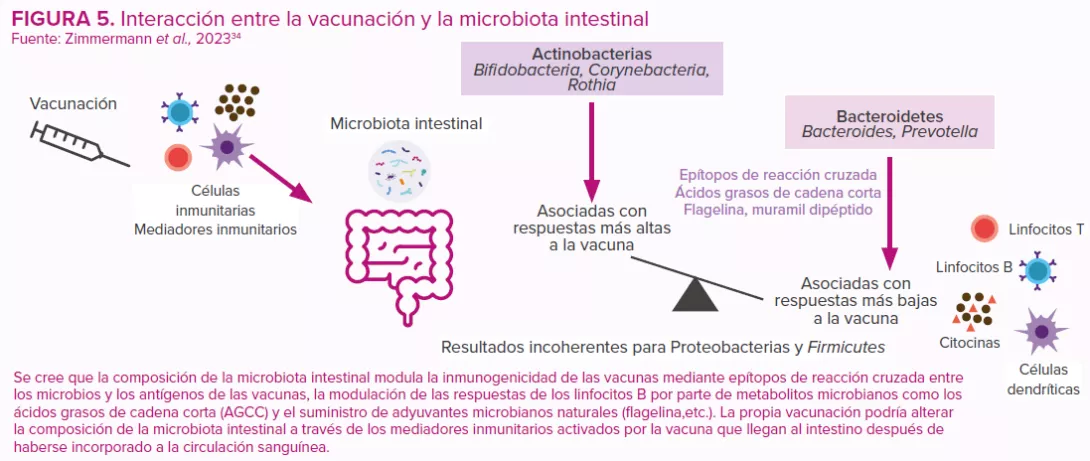 Desde su introducción en 2006, las vacunas orales contra el rotavirus han provocado a nivel mundial un descenso significativo del número de hospitalizaciones y muertes debidas a la diarrea por rotavirus.30 Sin embargo, la eficacia de las vacunas es muy variable y los países de bajos ingresos han obtenido peores resultados en comparación con la eficacia extraordinariamente alta (>90%) observada en los países de ingresos más altos.31 Se cree que los motivos de esta disparidad son multifactoriales (inmunidad del huésped, parámetros perinatales, genética, estado nutricional, estrés, consumo de tabaco y alcohol, vida en el campo o en la ciudad, tamaño de la familia, etc.). Como sucede con otras vacunas, se considera que la composición y función de la microbiota intestinal son factores clave que regulan la respuesta inmunitaria a la vacunación30,32,33 (Figura 5).