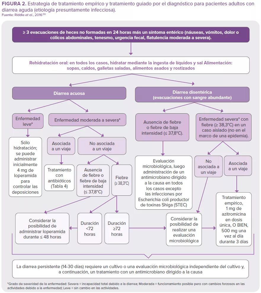 La mayoría de las infecciones intestinales son procesos autolimitados en las personas inmunocompetentes. No obstante, algunos pacientes (con deshidratación severa, enfermedad grave, fiebre persistente, heces sanguinolentas, inmunodepresión...) requieren exámenes diagnósticos específicos, que pueden incluir un hemograma completo, una valoración de la creatinina y los electrolitos, la verificación de la presencia de leucocitos y lactoferrina en las heces, un coprocultivo, junto con pruebas de detección de C. difficile, una PCR, una prueba de huevos y parásitos, una endoscopia y un estudio de imagen abdominal11. El American College of Gastroenterology (ACG)12 emite recomendaciones para el diagnóstico y el tratamiento de pacientes adultos con diarrea aguda de etiología presuntamente infecciosa (Figura 2). La investigación clínica en niños se basa en los mismos principios.23 En 2023, la Organización Mundial de Gastroenterología (WGO) incluyó en sus recomendaciones el uso de probióticos para la prevención y el tratamiento de algunas diarreas infecciosas57.