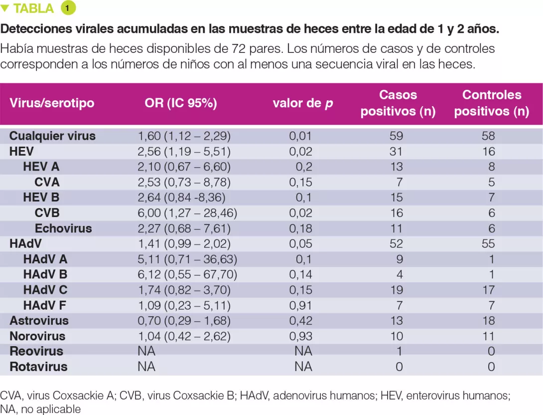 El porcentaje de muestras de heces positivas para cualquier virus variaba del 22 al 50 %, sin pico relacionado con la edad, y el de los enterovirus del 0 al 21 % después de 6 meses. Entre los 1 y 2 años, se detectaron enterovirus en 31 casos frente a 16 en los controles (Tabla 1). El número acumulado de muestras de heces positivas para cualquier virus estaba asociado a un mayor riesgo de autoinmunidad de la enfermedad celíaca (OR 1,60; p = 0,01), con una mayor asociación en el caso de los enterovirus (OR 2,56; p = 0,02).