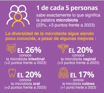 - En comparación con el último año, la gente es más consciente de la microbiota gracias a sus profesionales sanitarios, un avance alentador. Como resultado, el 45 % ha recibido una explicación sobre lo que es la microbiota, un indicador que es 6 puntos más alto que en 2023.