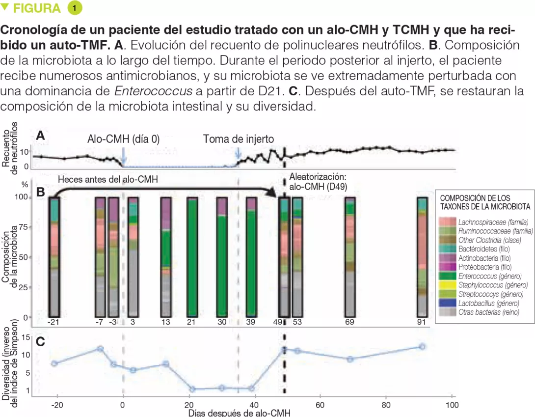 Los pacientes que reciben un alo-CMH se quedan inmunodeprimidos varios meses después del trasplante, y aunque pacientes inmunodeprimidos, incluidos los tratados con alo-CMH, hayan sido tratados sin efectos secundarios con un TMF heterólogo [5], los autores han considerado que un TMF autólogo sería más seguro, en concreto porque su naturaleza podría minimizar en el paciente el riesgo de exposición a microorganismos potencialmente patógenos aún sin detectar. Los autores han iniciado un ensayo clínico controlado aleatorizado con el objetivo de determinar la viabilidad del auto-TMF para restaurar la microbiota intestinal y para disminuir las complicaciones relacionadas con el alo- CMH. Aquí, presentan un análisis de las modificaciones de la composición de la microbiota intestinal en 25 pacientes aleatorizados en este estudio y de los cuales se recogieron muestras de heces longitudinalmente.
